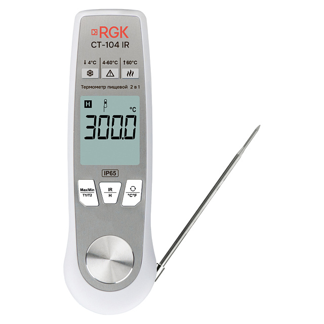 Термометр цифровой RGK CT-104 выполнен в виде складывающейся конструкции, благодаря чему обладает компактными размерами в нерабочем положении. Предназначенный для контактных измерений внутренней температуры жидких, вязких, сыпучих и прочих веществ, прибор оборудован тонким погружным зондом длиной 112,6 мм и диаметром в основной части 3,5 мм. В качестве сенсора в данном изделии используется термопара, за счет чего обеспечивается высокое быстродействие и точность измерителя.